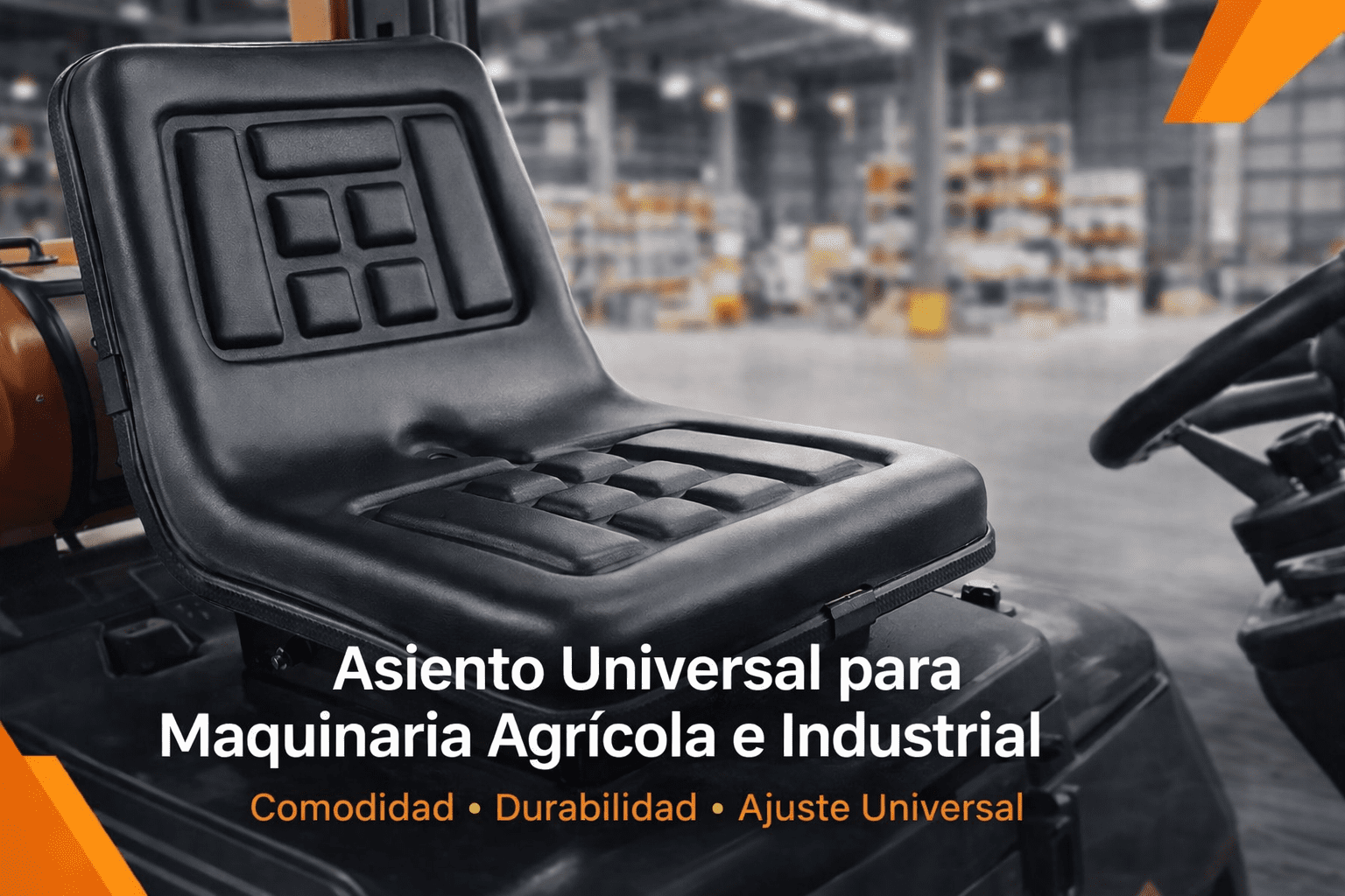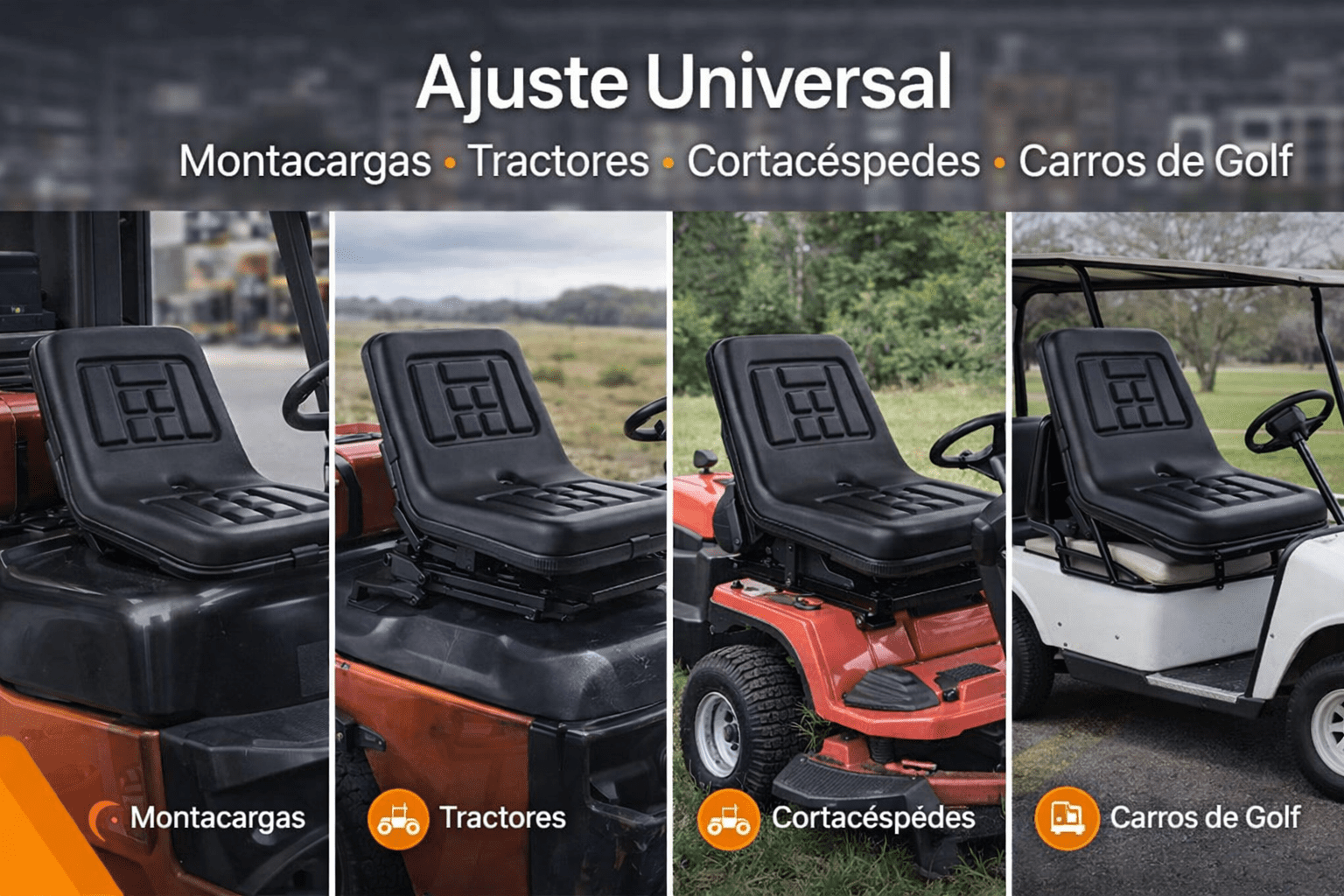 Asiento universal diseñado como recambio para maquinaria agrícola, industrial y de mantenimiento. Es compatible con carretillas elevadoras, tractores, cortacésped, segadoras, tractores cortacésped, carritos de golf y otras máquinas similares.