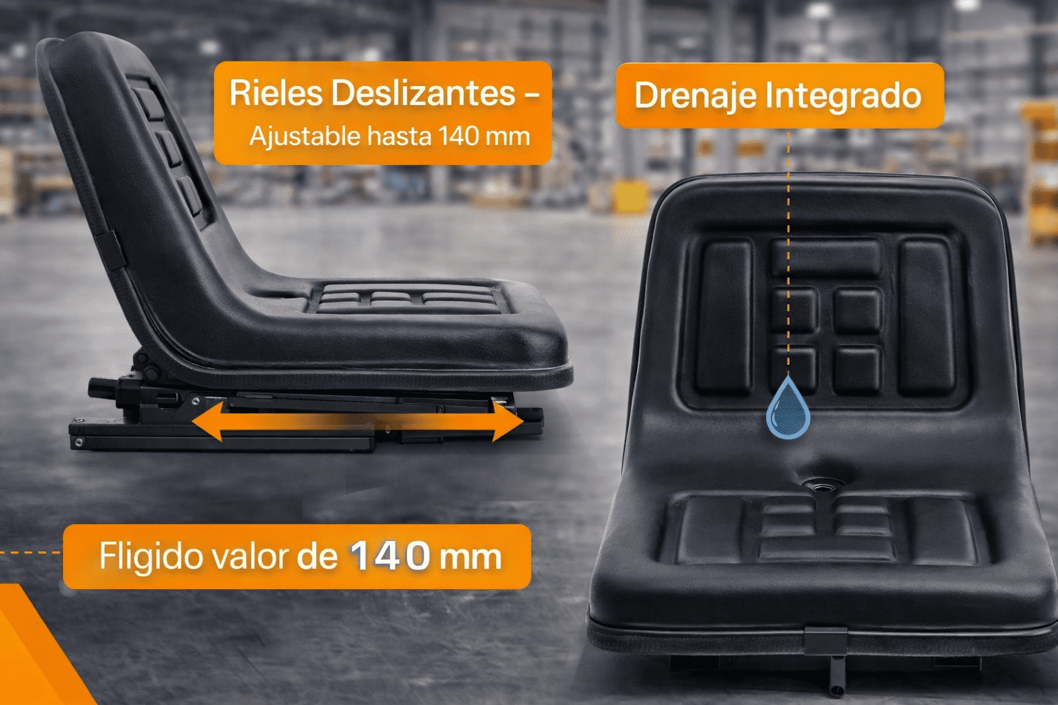 Incorpora rieles deslizantes inferiores, que permiten ajustar la posición del asiento hacia adelante y hacia atrás hasta 140 mm, facilitando la adaptación a la altura del operario y mejorando la comodidad y el control.