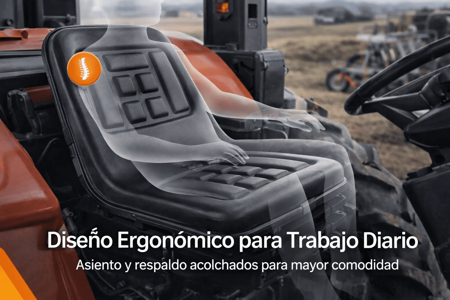 El asiento cuenta con acolchado integrado en asiento y respaldo, ofreciendo una base firme y cómoda que ayuda a mantener una postura estable durante el manejo de la máquina.
