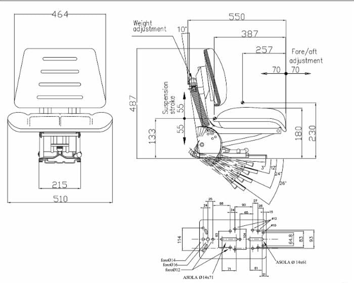 Además, incorpora regulación de peso del operario, ajuste de inclinación del anclaje de suspensión y guías correderas, lo que permite adaptar el asiento a distintas posiciones y tipos de máquinas.
