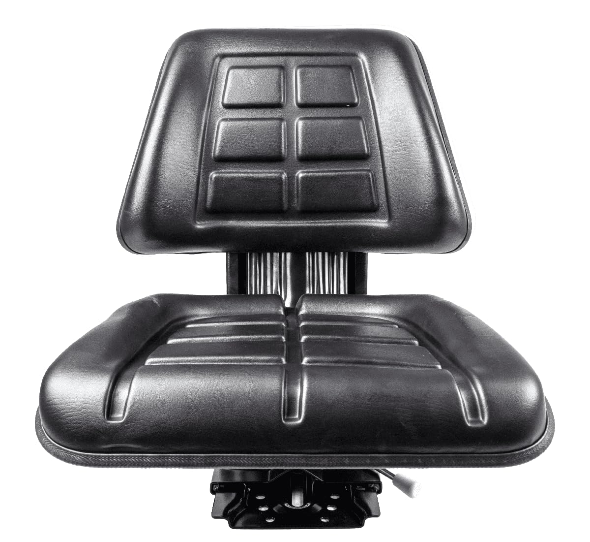Tapizado en PVC negro resistente, fácil de limpiar y apto para uso en exteriores, este modelo destaca por su suspensión trasera reforzada con 2 muelles y 1 amortiguador, lo que reduce el impacto de las vibraciones y mejora la ergonomía durante largas jornadas de trabajo.