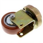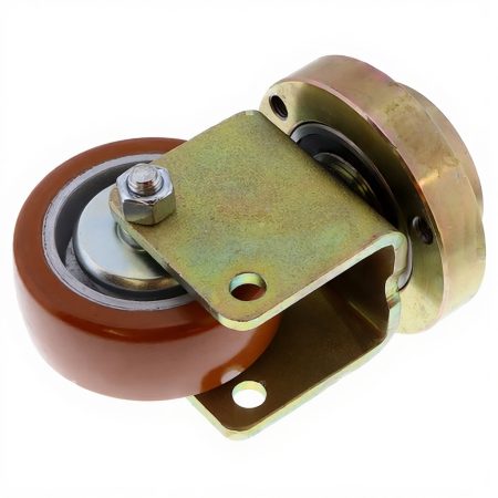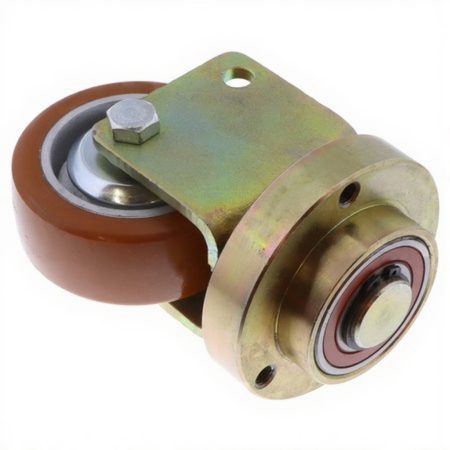 Rueda pivotante completa con soporte giratorio, fabricada con llanta de acero/fundición y banda de rodadura en poliuretano. Incluye placa superior cilíndrica, 3 orificios de fijación M10 y protector de hilo integrado. No incorpora freno ni sistema de amortiguación.
